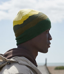 95% recycled polyester/4% nylon/1% elastane. Double layer knit.Pull on style.Bold mountain scape design.Tear out label.
